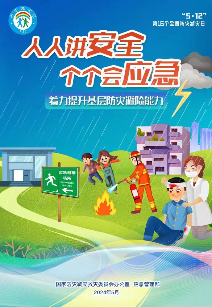 5月12日是我国第16个“全国防灾减灾日”,主题是“人人讲安全、个个会应急――着力提升基层防灾避险能力”